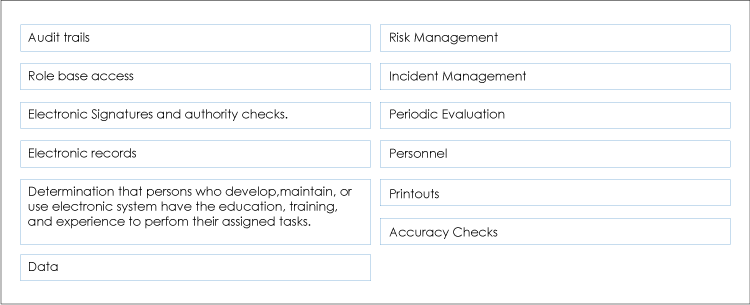- 21 CFR (Code of Federal Regulations) Part 11 has defined by the US FDA regulations that set forth the criteria applies to electronic records and electronic signatures that persons create, modify, maintain, archive, retrieve, or transmit under any records or signature requirement set forth in the Federal Food, Drug, and Cosmetic Act, the Public Health Service Act, or any FDA regulation