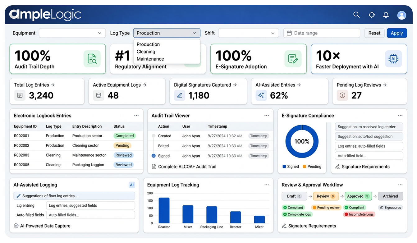 AmpleLogic هو نظام سجل إلكتروني متوافق مع GMP مصمم خصيصًا لتلبية احتياجات برامج سجل إنتاج الأدوية. قم بإغلاق فجوة السياق التشغيلي بين المعدات القديمة وأنظمة MES الحديثة من خلال السجلات غير الورقية المدعومة بالذكاء الاصطناعي في تصنيع الأدوية - رقمنة الملاحظات دون التأثير على منطق النظام الذي تم التحقق منه.
