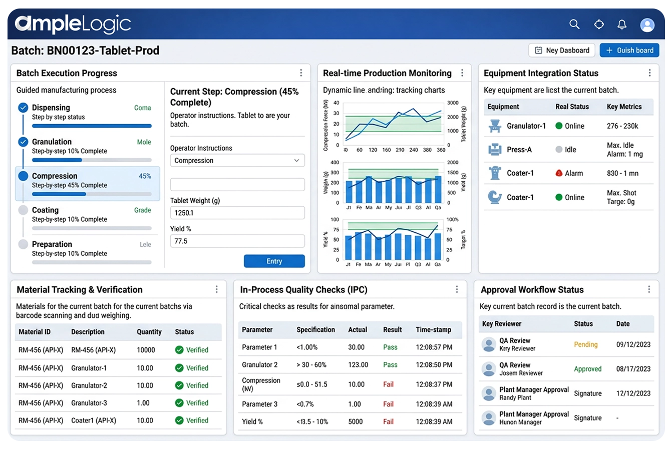 AmpleLogic eBMR/MES digitizes batch manufacturing with real-time shop floor execution, equipment integration, and review by exception -- cutting batch release time by 50% while maintaining full 21 CFR Part 11 compliance.