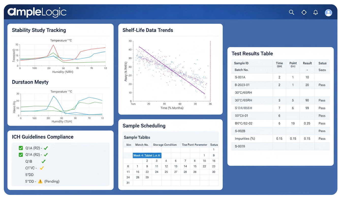AmpleLogic delivers end-to-end stability schedule management — from stability test protocol creation and stability schedule calendar planning through chamber monitoring, test execution, trend analysis, shelf-life determination, and regulatory-ready reporting aligned to ICH Q1A, FDA, and GMP requirements.