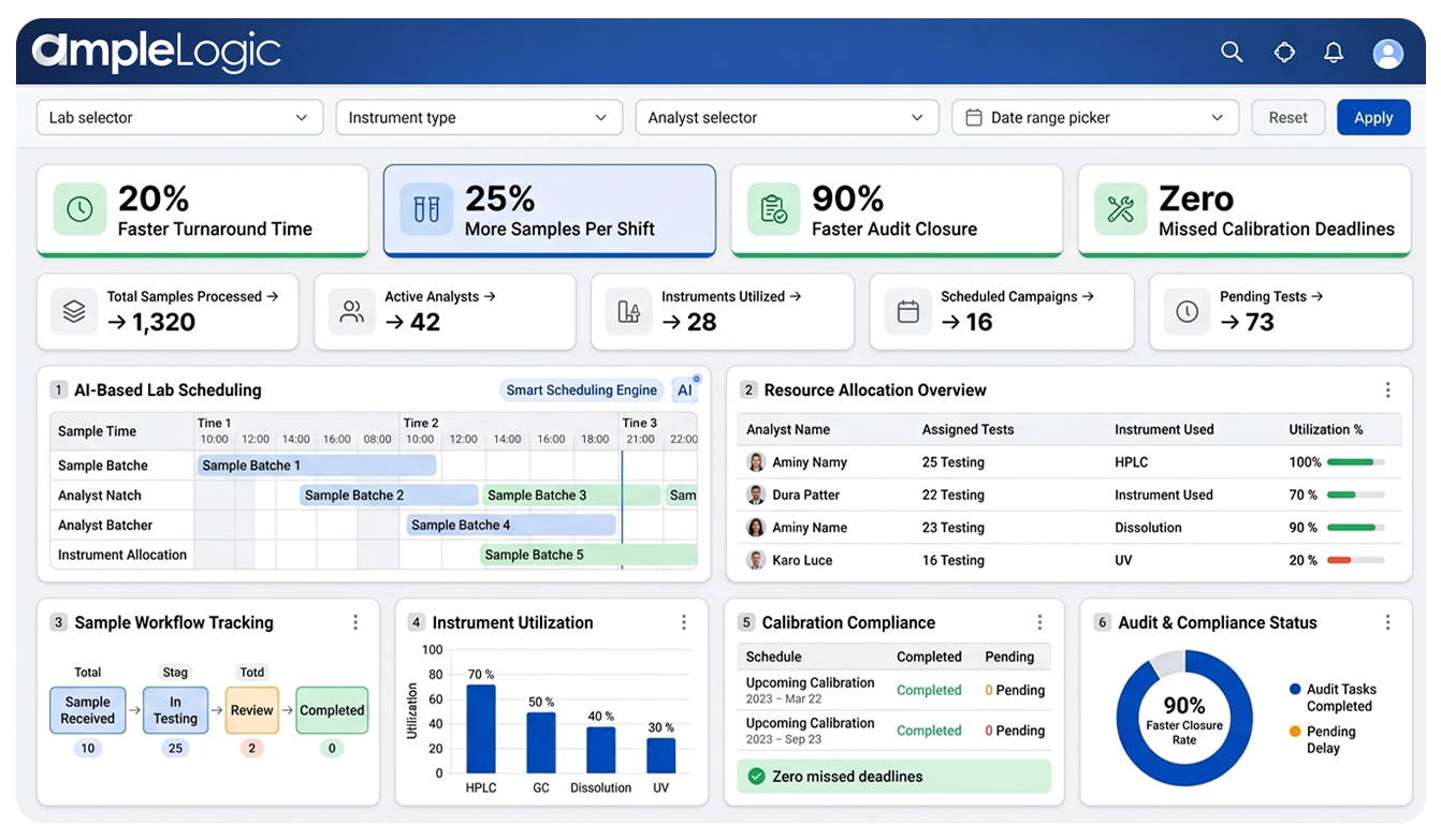 AmpleLogic QC計画がパーソナライズされたデモで、ラボのスケジューリング、リソース配分、コンプライアンスをどのように最適化できるかをご覧ください。