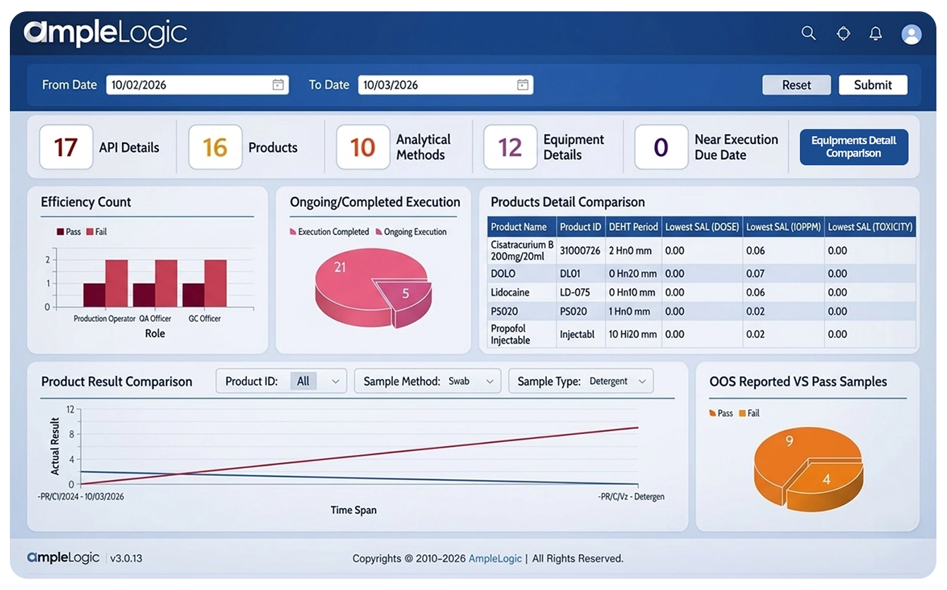 Residue limit determination is a fundamental component of cleaning validation to ensure that acceptable levels of active pharmaceutical ingredients (APIs) or cleaning agents remain on equipment surfaces after cleaning. AmpleLogic's platform provides automated tools to calculate safe residue limits based on regulatory guidance.
